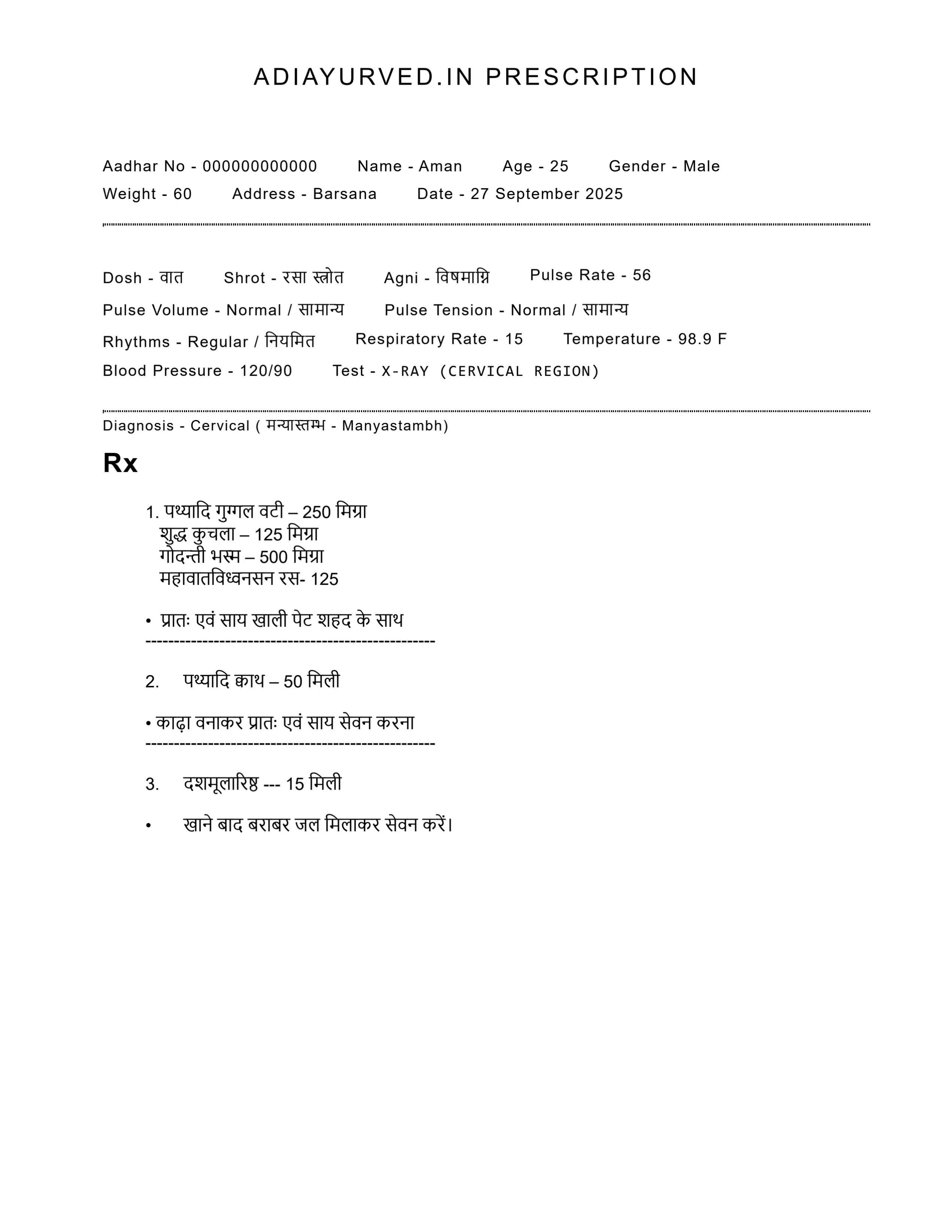 "Adiayurved.in is the only website in the world that allows doctors to generate and print fully authentic Ayurvedic prescriptions automatically. By simply searching for a disease, doctors receive precise treatment recommendations, dosage instructions, and detailed information about the condition, all tailored to each patient’s profile. Each prescription is carefully structured to be clear, professional, and easy to follow, ensuring that patients can understand and adhere to their treatment plans without confusion. The platform maintains complete security of patient data while offering doctors the convenience of managing records, monitoring treatment progress, and printing prescriptions that are officially documented and reliable. This combination of technology, authenticity, and personalization makes Adiayurved.in a one-of-a-kind platform for holistic healthcare, empowering doctors to deliver accurate and trustworthy care while providing patients with genuine, well-documented guidance for their health journey."
